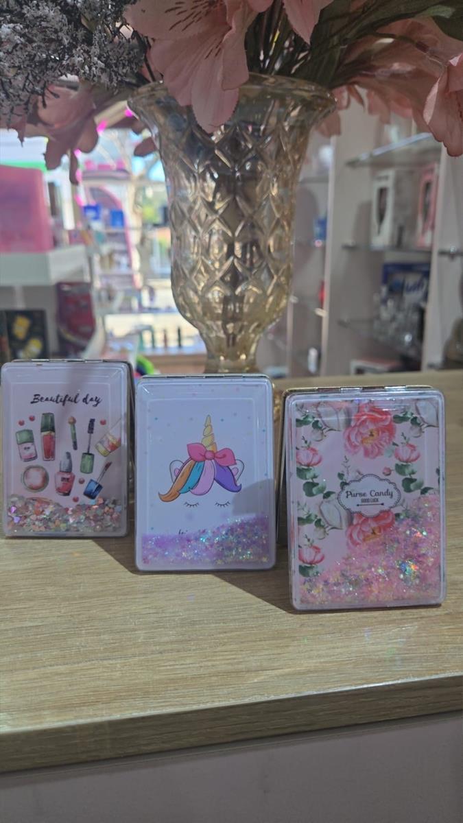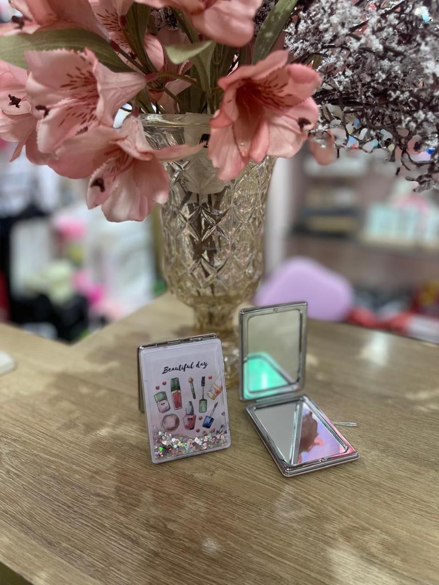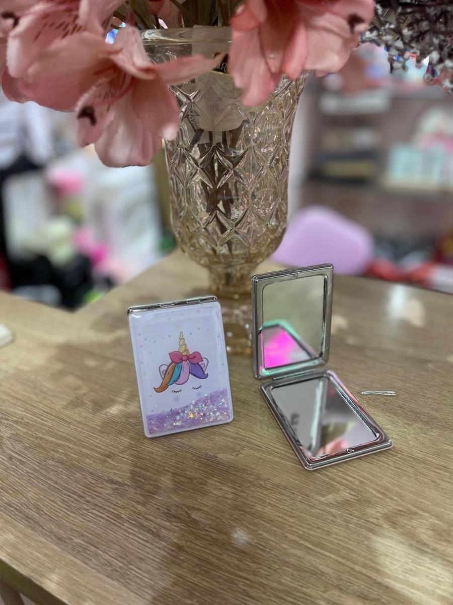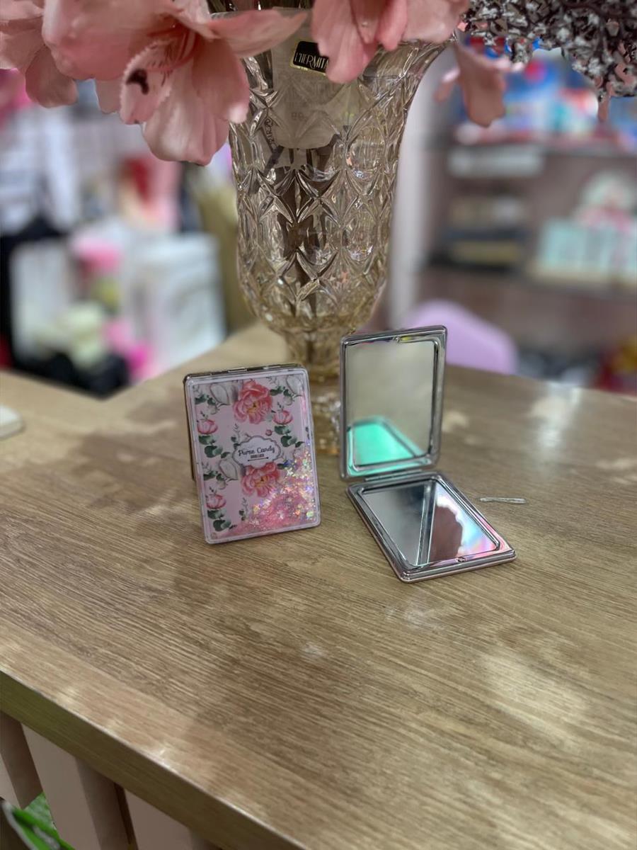 Espelho compacto de bolsa com lente normal e lente de aumento. Designer exclusivo , com efeito glitter na água.