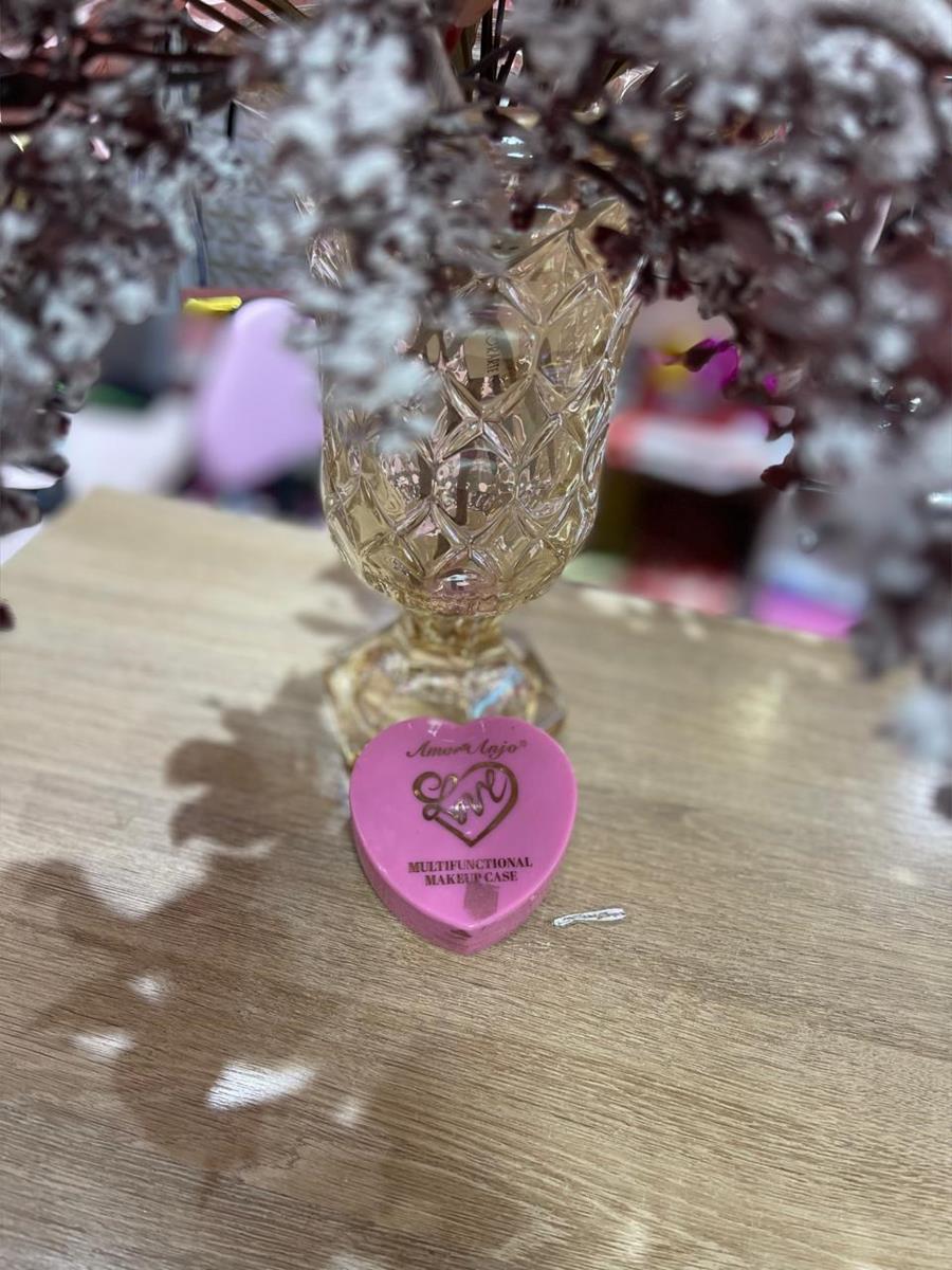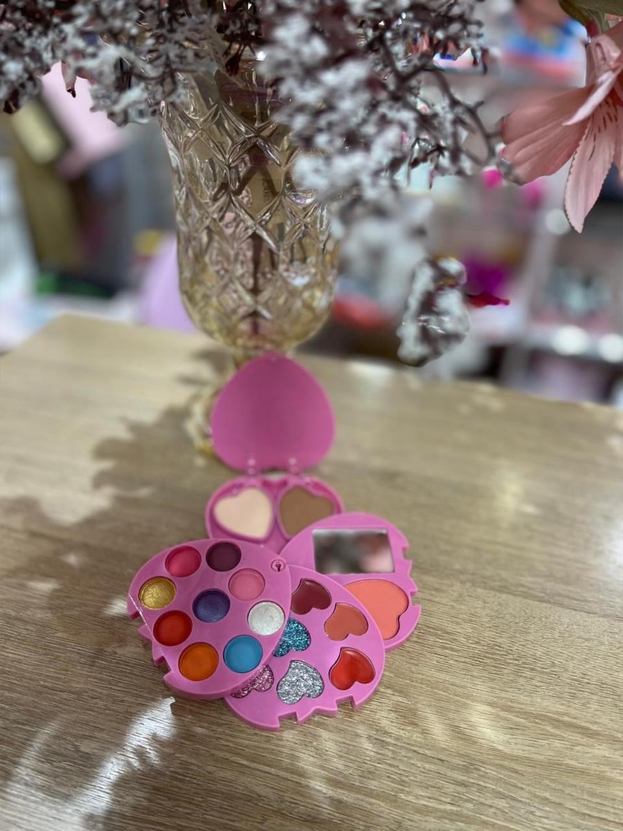 Paleta multifuncional em formato de coração , com 4 divisórias contendo sombras, glitter, blush, iluminador e espelho. Cores vivas e vibrantes! As adolescentes também vão amar!